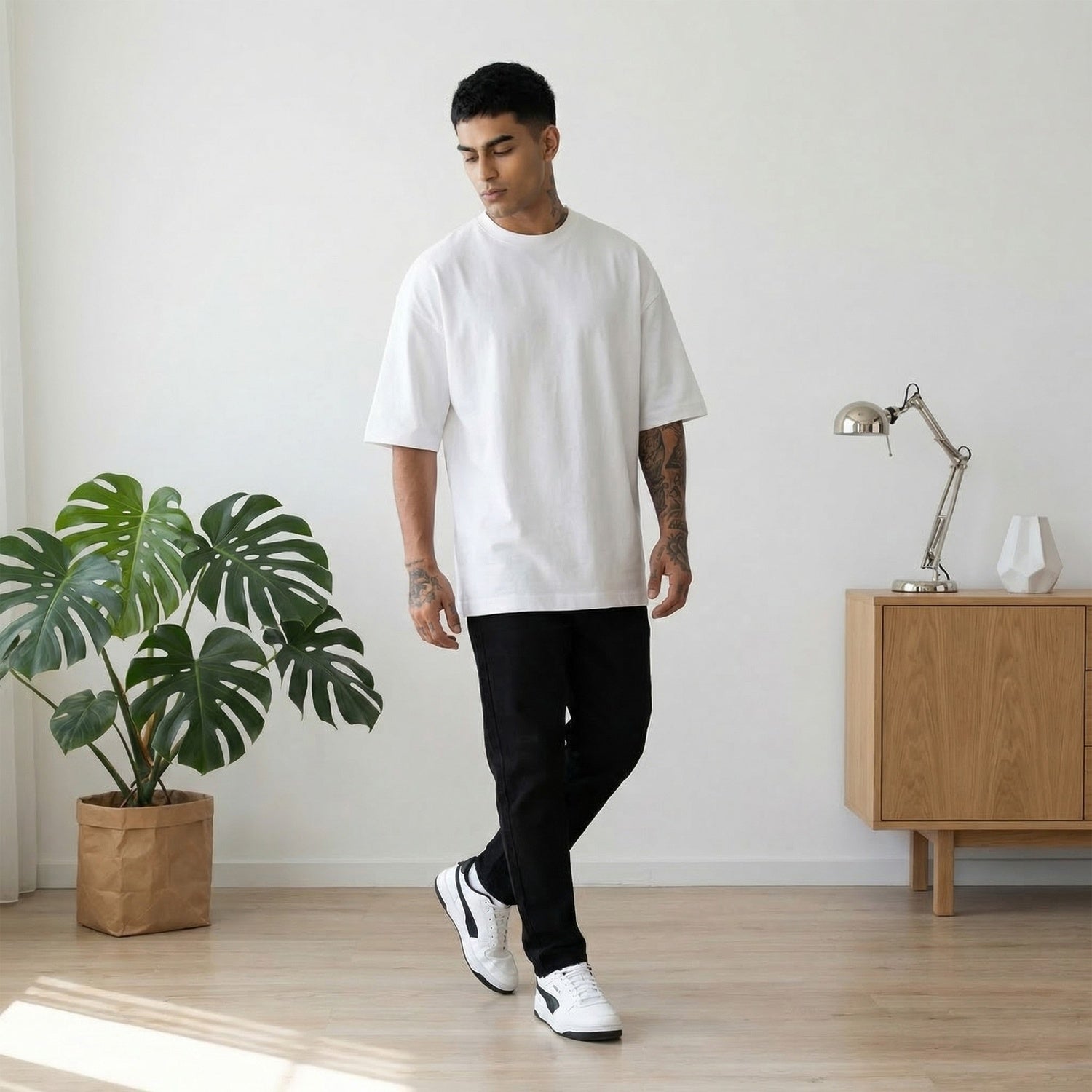 The Men’s Oversize Essential Crew Tee – White is an oversized fit T-shirt made from 100% pure cotton for breathable, all-day comfort. The white color adds a clean, timeless touch while keeping the look minimal—perfect for everyday wear or layering.